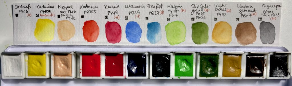 Da Schmincke die Pigmente angibt, kann ich an diesen Farben gut lernen, welche Farben mir tatsächlich gefallen und dieses Wissen auf andere Medien und Marken anwenden. Auch wenn andere Firmen ihre Farben dann anders nennen, kann ich anhand des Pigments erkennen, was mich erwartet.