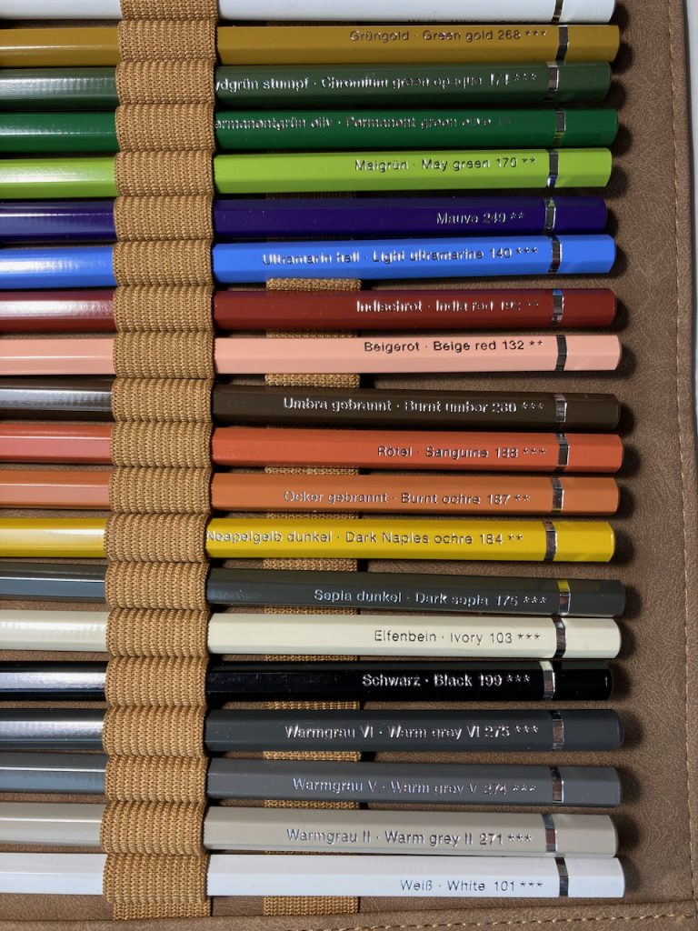 Ich male mit den Faber-Castell Albrecht Dürer Aquarell-Buntstiften und den Polychromos Buntstiften. Da beide von Faber-Castell sind, kann ich die gleiche Farbe einmal als Aquarellstift und einmal als Buntstift kaufen. Das finde ich praktisch, wenn ich die Stifte zusammen benutze.