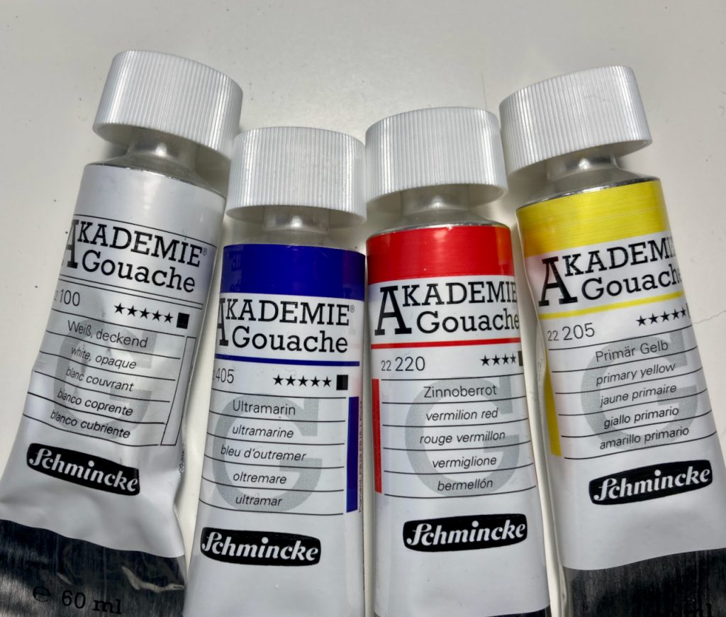 Da ich die Gouachefarbe in Tuben habe, nutze ich sie völlig anders als die Aquarellfarben. Aquarellfarben mische ich beim Malen auf der Palette. Die Gouachefarben habe ich in etwas größeren Mengen schon zu Tönen gemischt, die mir gefallen und in meiner verschließbaren Eiswürfelbox zum Malen bereit. Ich vermisse daher aktuell auch keine Farbe. Dennoch ist es natürlich bequemer einige häufig genutzte Töne zumindest schon annähernd aus der Tube zu bekommen.
